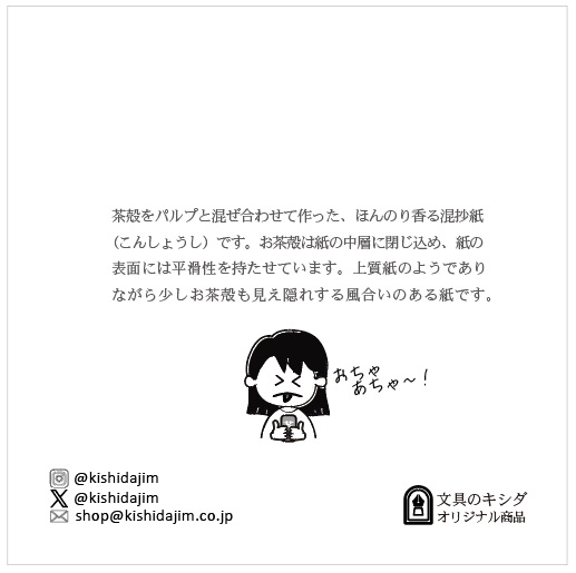 茶殻をパルプと混ぜ合わせて作った、ほんのり香る混抄紙(こんしょうし)です。お茶殻は紙の中層に閉じ込め、紙の表面には平滑性を持たせています。上質紙のようでありながら少しお茶殻も見え隠れする風合いのある紙です。